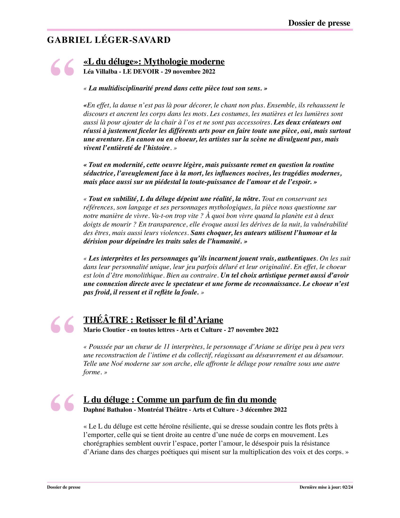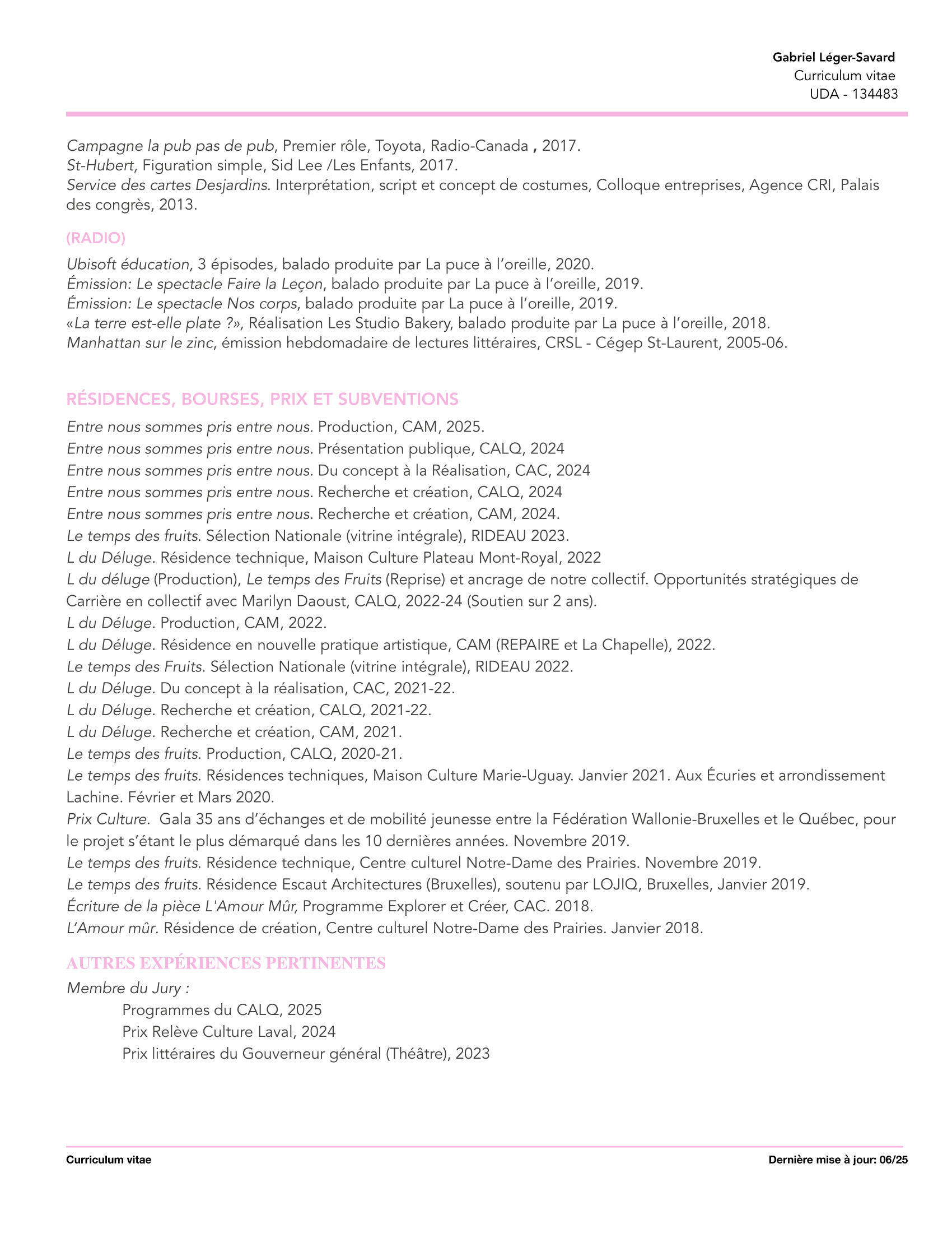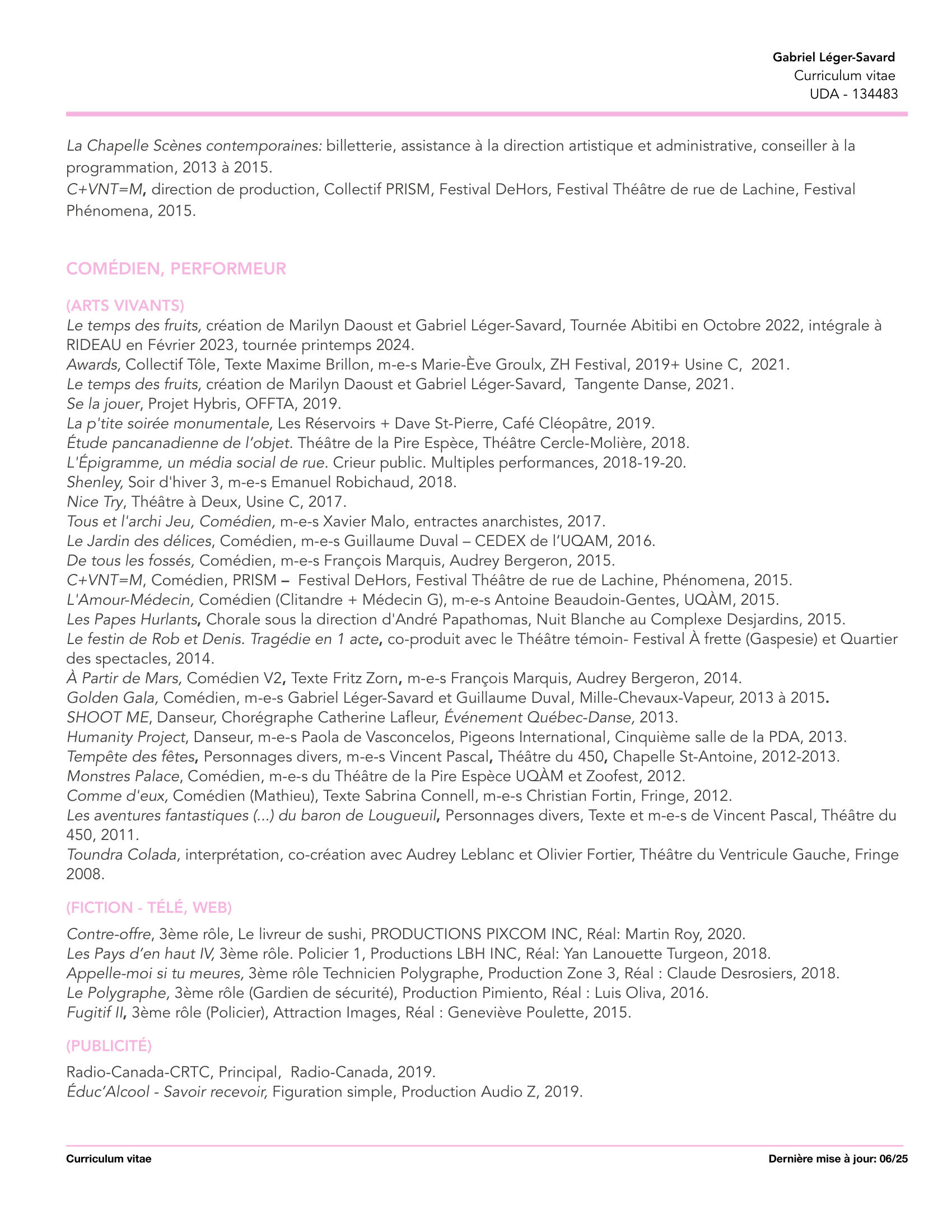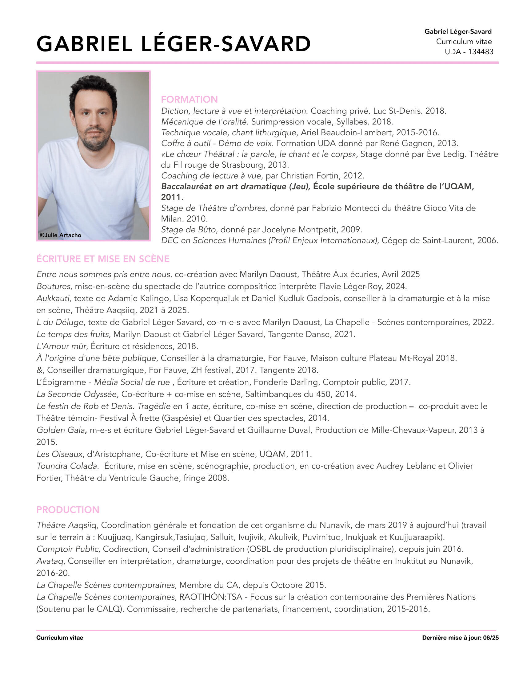 Depuis les centaines de spectacles en pyjama dans ma chambre au début des années 90, je n'ai jamais pensé faire autre chose.J'ai grandi, je suis maintenant une belle pièce d'homme, mais mon esprit trépigne toujours comme un enfant tannant. Alors, me voici, n'écoutant que ma vocation, je me suis formé comme comédien.En plus d'être féru d'histoire et de politique; on me dit sensible, sympathique et borderline funky. Je cumule maintenant de multiples expériences liées au théâtre (travail corporel, chœur, objets, ombres, écriture, mise en scène, radio, podcast, télévision, publicité et théâtre de rue). J'ai travaillé comme interprète professionnel au sein de plusieurs projets depuis les dix dernières années (voir section Comédien de ce site web).J'ai toujours eu à cœur la création, celle qui rassemble, qui arrive à toucher les humains (voir section Créateur de ce site web).Ma démarche de création m’emmène depuis 2019 à explorer les frontières poreuses entre la danse et le théâtre avec la chorégraphe Marilyn Daoust. Ensemble, nous avons créé trois œuvres : Le temps des fruits (Tangente), L du déluge. (La chapelle), Entre nous sommes pris entre nous (Aux écuries). Depuis 2025, nous avons officialisé notre collaboration via Mille FeuxArtiste dans la cité, je suis incapable de ne pas utiliser mon art (la meilleure des sciences humaines) pour tenter de contribuer à améliorer la marche de l'histoire. J'ai contribué à la fondation du Théâtre AAQSIIQ, une compagnie de théâtre inuit au Nunavik qui fait rayonner cette riche culture et la langue inuktitut en plus de créer emplois et fierté. J'y agis toujours comme coordonnateur général. Entre 2016 et 2021, j'ai codirigé aussi l'OSBL Comptoir public, un collectif de production pluridisciplinaire. J'ai aussi siégé (et encore aujourd'hui) sur des CA du milieu artistique.Les sillons que j'ai creusés jusqu'à maintenant m'orientent me définissent comme créateur et interprète. C'est outillé de ces expériences que je souhaite faire naître des communautés, briser les silos, les divisions et l'isolement. Nous n'avons pas le choix de nous rassembler pour faire face aux années qui s’en viennent. Ayons du plaisir, discutons et agissons : ensemble.