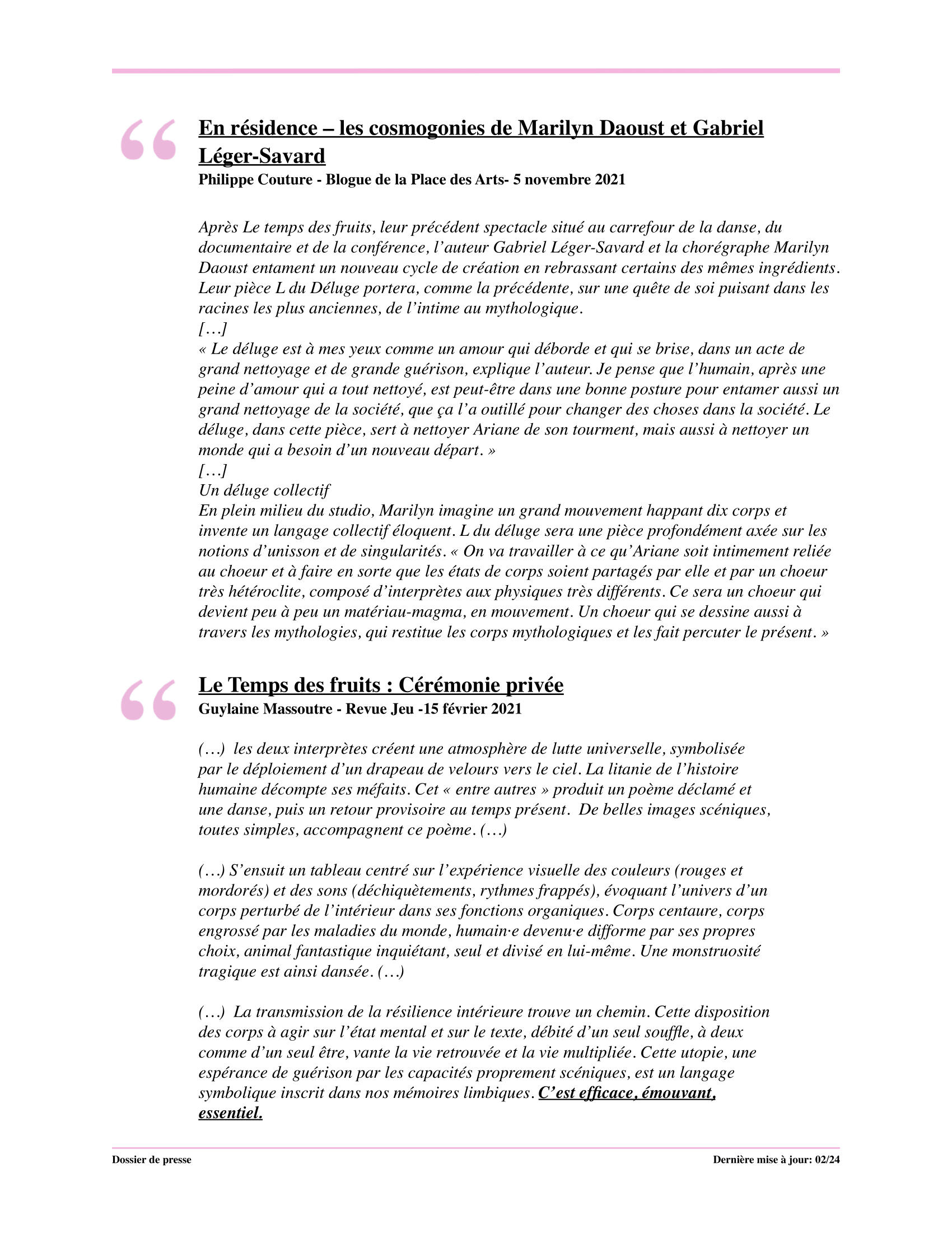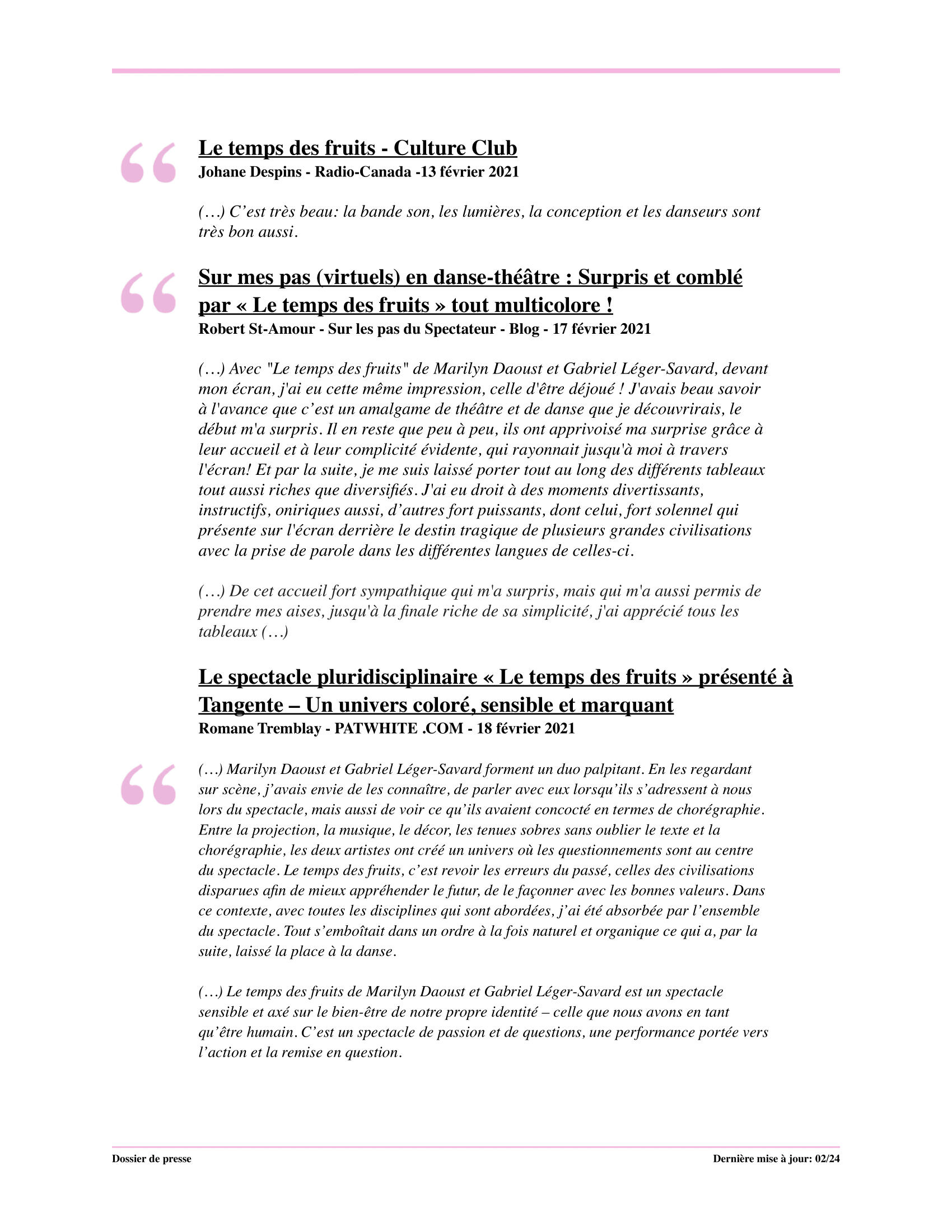 Webiffusion à Tangente, Maison Culture Marie-Uguay, L'Arrondissement Lachine, Théâtre Aux Écuries, L’Espace culturel de Notre-Dame-des-Prairies, Le Bloc.danse, L'Escaut Architectures.Tournée québécoise entre 2022 et 2024Support financier: Conseil des Arts et des Lettres du Québec et LOJIQ.