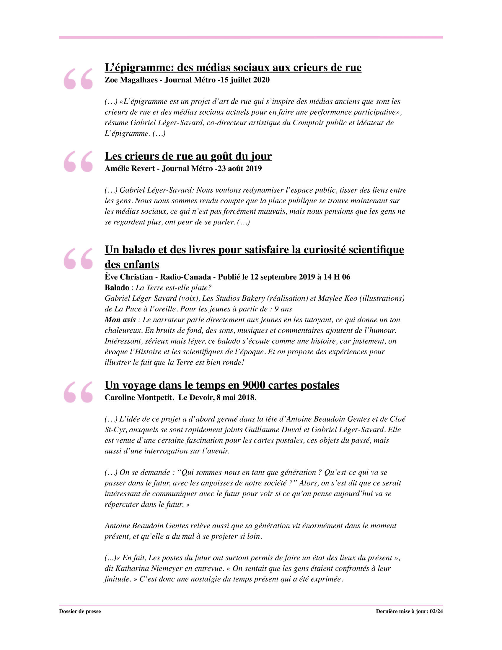 Description: L'épigramme est un média artistique d'informations vivantes, un babillard humain, qui s'est donné comme devoir de susciter la discussion et la vie sur la place publique en partageant des paroles citoyennes. L'épigramme puise ses informations à même les rues, les murs et les habitants des lieux qu'il investit.