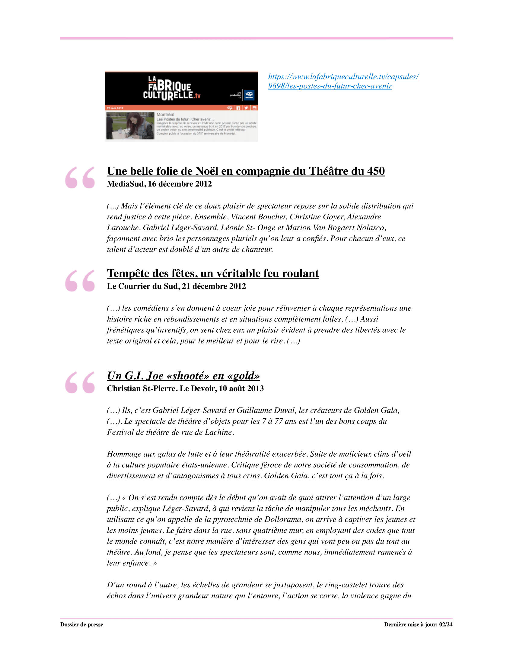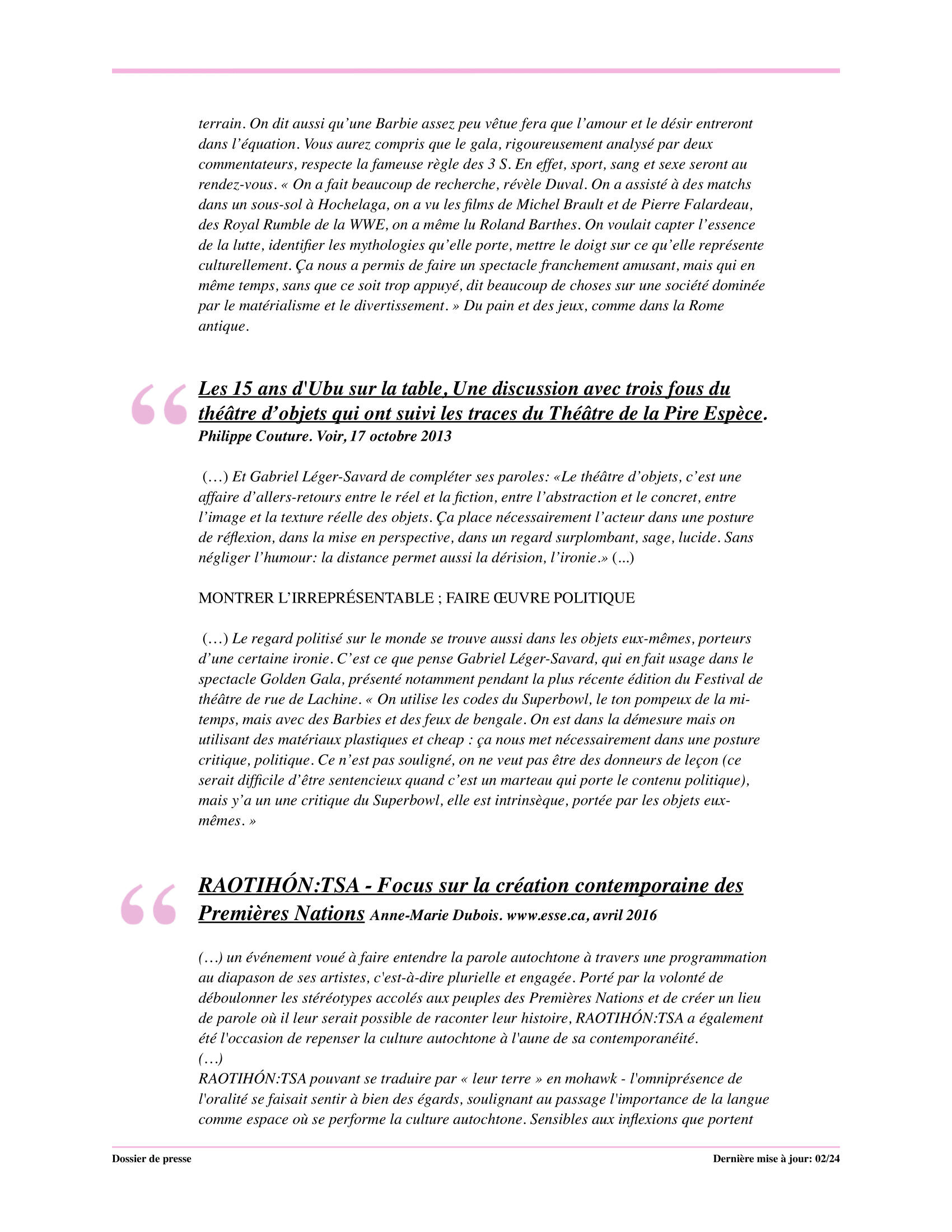 * Théâtre témoin, Partenariat du quartier des spectacles, résidence à Van Horn Station (V.H.S).*Co-création:
